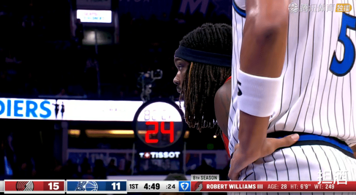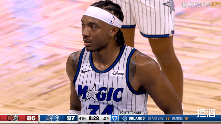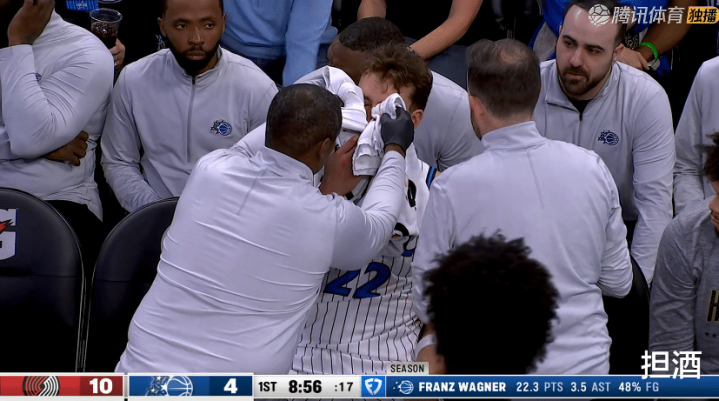 魔术开局有些慢热,以阵容实力来看,还是要强于开拓者一头的,这次暂停,是因为小瓦格纳鼻子受伤,在场边处理。